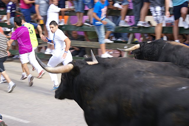 La vuelta de los novillos ha originado uno de los encierros más largos. Unos siete minutos aproximadamente han tardado los potentes novillos de Hnos. Martínez Pedrés en completar el recorrido que hoy, por ser sábado, ha estado abarrotado de público y corredores que, por otro lado, han ofrecido estupendas y vistosas carreras.