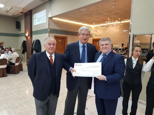 1.400 euros que se entregaron a los responsables de la AECC, Manuel Molina Boix, vicepresidente de la Asociación Española contra el Cáncer en la Región de Murcia y director de Salud Pública de la CARM, y Antonio de Béjar, presidente de la AECC en Calasparra, el pasado sábado en la cena contra el cáncer que organiza la entidad en el municipio todos los años.