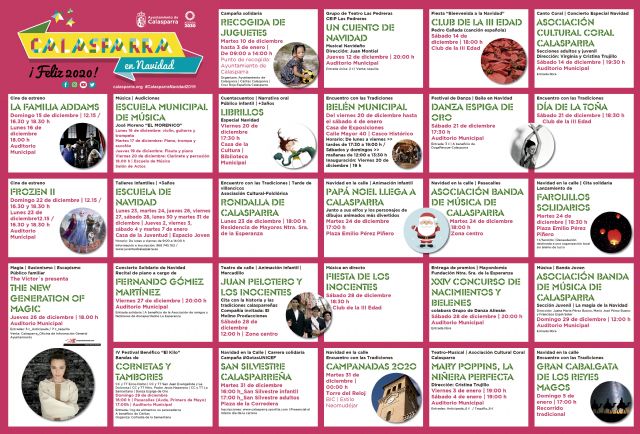 Una cita que no nos podemos perder es el concierto del calasparreño Fernando Gómez Martínez que llevará a cabo un estupendo recital de piano. “The New Generation of Magic”, magia, ilusionismo y escapismo para el público familiar el jueves 26 de diciembre. «FROZEN II» (Cine de estreno) y «La Familia Addams», unirán a la familia frente a la gran pantalla. Para los más pequeños la diversión está garantizada y no tendrán tiempo de aburrirse. La escuela de Navidad, organizada por la concejalía de Juventud, es el lugar donde los más pequeños hacen realidad todo lo que imaginan: talleres de manualidades, juegos y cocina, entre otros, ocupan las mañanas de los días de vacaciones. Juegos populares en la calle, la visita de Papá Noel y los Reyes Magos, con su espectacular cabalgata de música, baile y personajes, completan una programación de lo más animada que sitúa a los niños y niñas en el centro de la actividad festiva.