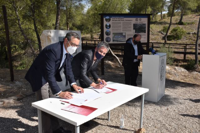 La alcaldesa de Calasparra, Teresa García, y el Rector de la Universidad de Murcia, José Luján, han firmado hoy, en los Abrigos del Pozo de Calasparra, dos convenios de colaboración.