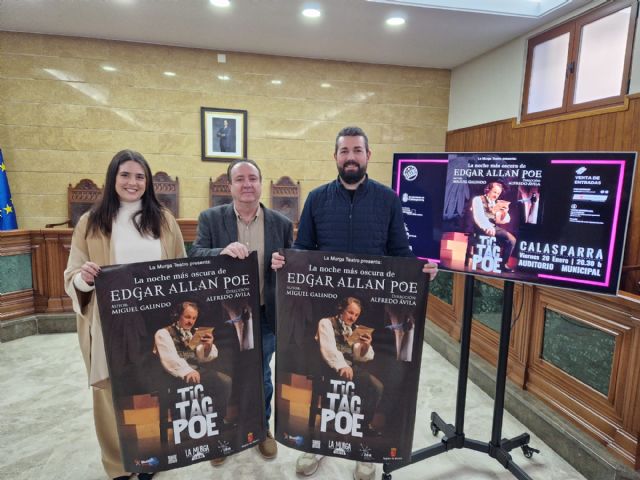 Los ediles del Ayuntamiento de Calasparra, Cristina Ruiz y Antonio Merino, acompañados por el director de la obra Alfredo Ávila, han presentado esta mañana en el consistorio de la localidad. “TIC, TAC… POE” narra en 90 min. las últimas y terroríficas horas de Edgar Allan Poe, tal y como las imaginó el autor de esta obra teatral, Miguel Galindo. Unas horas en las que Poe sufrirá el mismo terror que vivieron sus incontables lectores con sus narraciones.