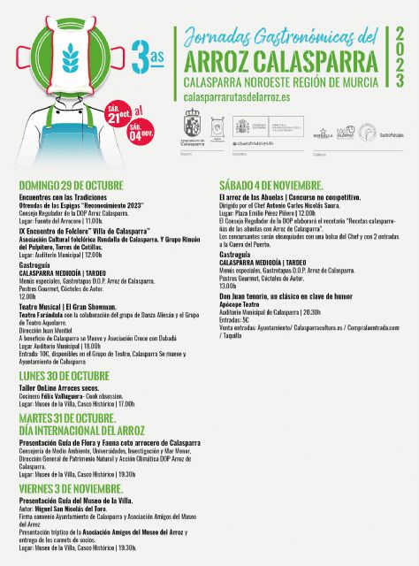 Para ello, desde el Ayuntamiento junto al Consejo Regulador de la DOP Arroz Calasparra y la Asociación Amigos del Museo, se han organizado las III JORNADAS GASTRONÓMICAS DEL ARROZ DE CALASPARRA que tendrán lugar en los días previos y posteriores al Día Internacional del Arroz.