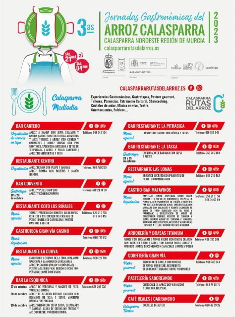 Una docena de restaurantes situados entre el casco urbano y la periferia de Calasparra el entorno del monumental Santuario de la Esperanza y su vía de acceso, junto a la vecina pedanía de la zona Sur (Valentín) , configuran parte de la guía gastronómica de la villa arrocera "Calasparra Mediodía". Donde se puede saborear el primer arroz con denominación de origen en una amplia variedad, hay mucho donde elegir: arroces melosos, caldosos, secos, en paella, incluso algún establecimiento apuesta por platos marineros del litoral murciano como la caldera, ¡A disfrutar!
