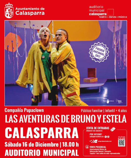 El próximo 16 de diciembre a las 18,00 h, el Auditorio Municipal Calasparra nos ofrece el nuevo espectáculo de la premiada Compañía PupaClown: "La aventura de Bruno y Estela", dentro de la programación de otoño para la infancia.