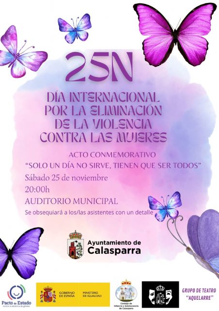 El próximo sábado 25 de noviembre, a partir de las 20:00 horas, se conmemorará el día internacional por la eliminación de la violencia contra la mujer con un acto en el Auditorio Municipal de Calasparra.