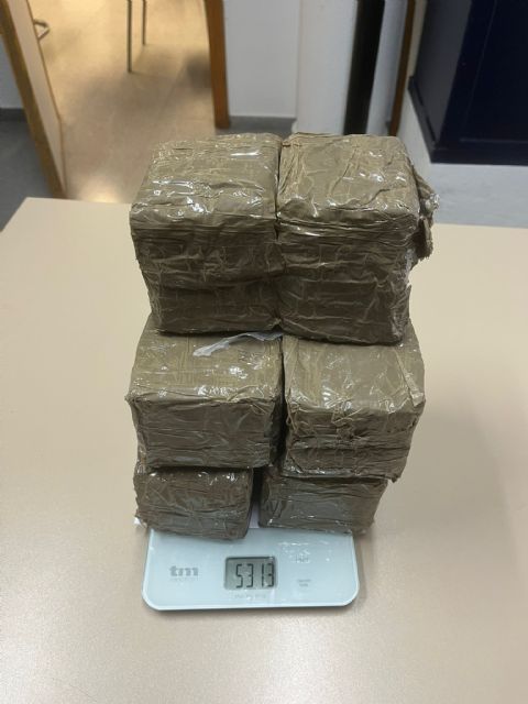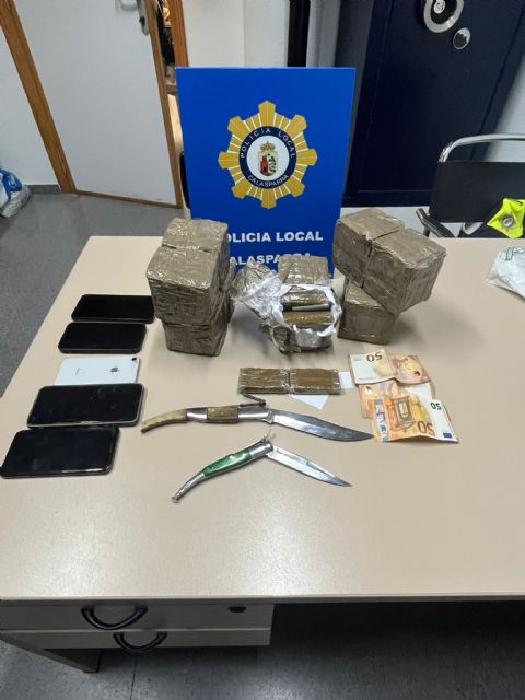 La actuación policial se saldó con la aprehensión de un total de 5,5 kilogramos de hachís, distribuidos en tabletas preparadas presuntamente para su distribución, así como la incautación de armas blancas encontradas durante la intervención.