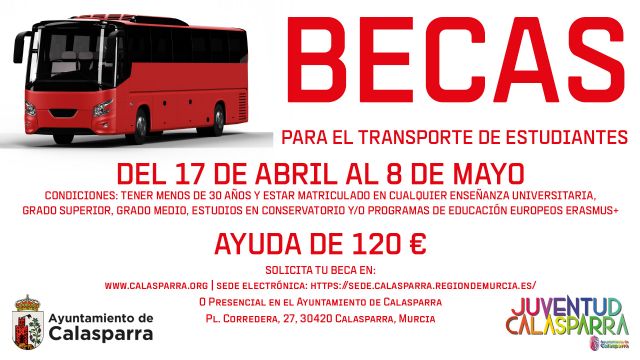 Estas ayudas tienen como objetivo contribuir a sufragar los gastos de desplazamiento de los jóvenes del municipio que deben trasladarse a otras localidades para cursar estudios que no se imparten en Calasparra. La convocatoria está dirigida a estudiantes menores de 30 años empadronados en el municipio.